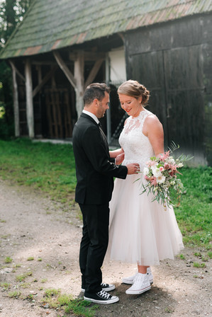 Stress was niet nodig, alles verliep op rolletjes; de fotoshoot, de geloften, de speeches en de kus, om vervolgens alles los te laten en helemaal los te gaan op de muziek. Andy en Jamie hadden het goed bekeken. Geen deftige schoenen of zere voeten, maar gewoon een goed paar Allstars, waar je de hele dag zonder moeite op door kan komen en misschien nog wel belangrijker, waar je urenlang op kan dansen. Want een knappe vent (of dame) die zān benen stil kon houden op deze plaatjes. Andy en Jamie weten wel wat muziek is. (Het liedje bij hun openingsdans was ā Editors - Ocean of Nightā - dat nummer heb ik na hun bruiloft echt plat gedraaid.)